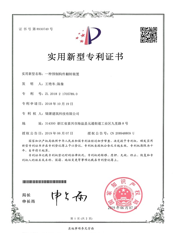 專利證書-一種預(yù)制構(gòu)件翻轉(zhuǎn)裝置