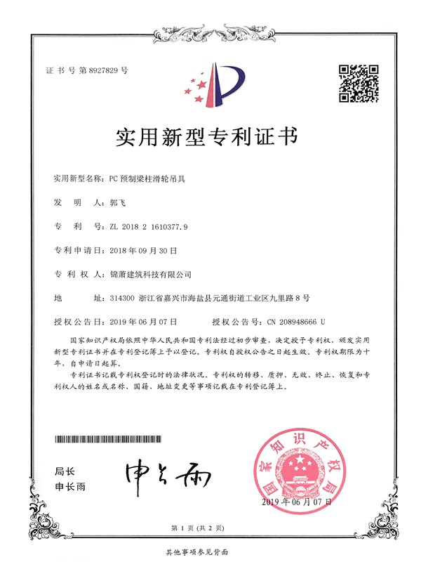 專利證書-PC預(yù)制梁柱滑輪吊具