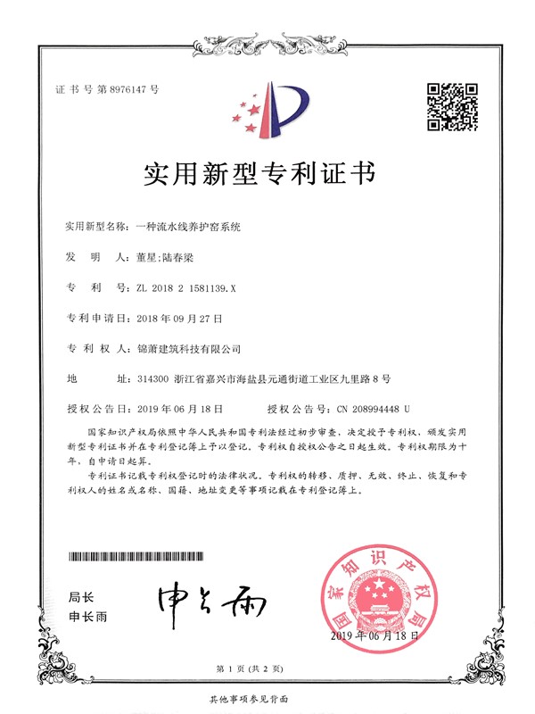 專利證書-一種流水線養(yǎng)護窯系統(tǒng)