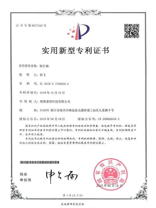 專利證書-取釘器