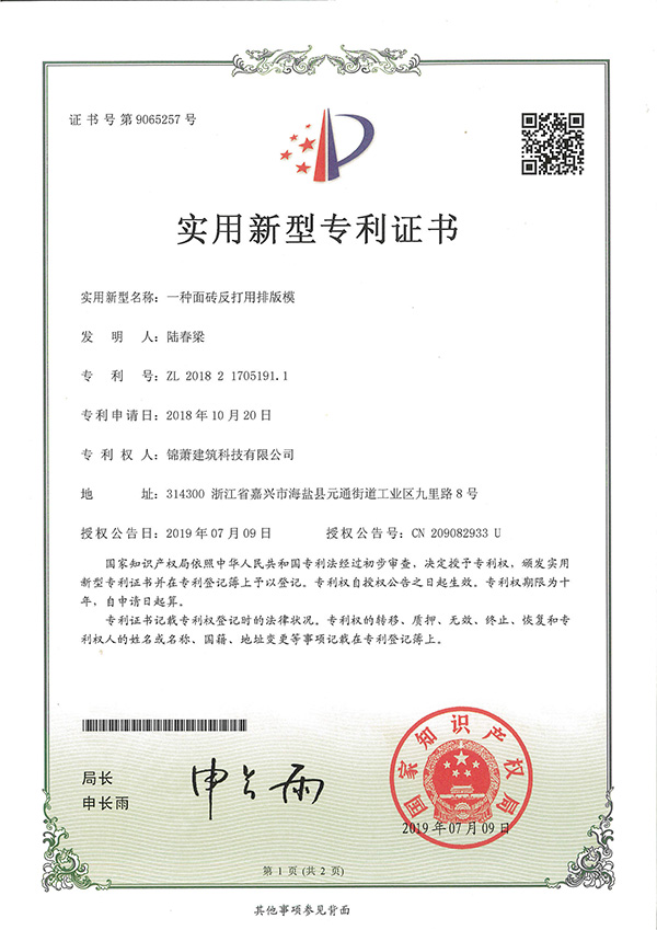 專利證書-一種面磚反打用排版模