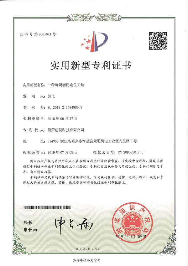 專利證書-一種可調(diào)套筒定位工裝