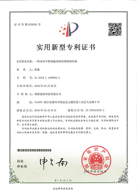 專利證書--一種具有中框保溫結(jié)構(gòu)的預(yù)制填充墻