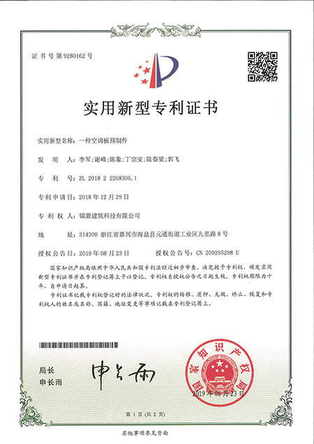 專利證書--一種空調(diào)板預(yù)制件