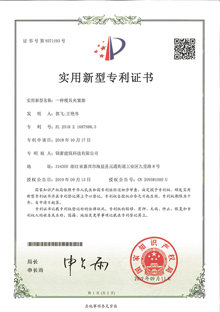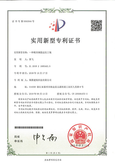專利證書--一種模具鋼筋定位工裝