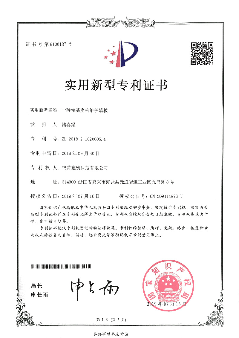 專利證書-一種帶基座的維護墻板